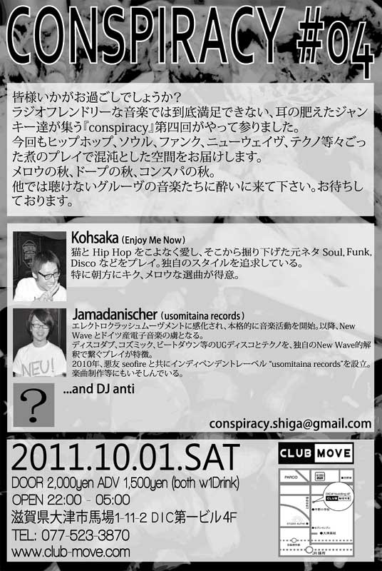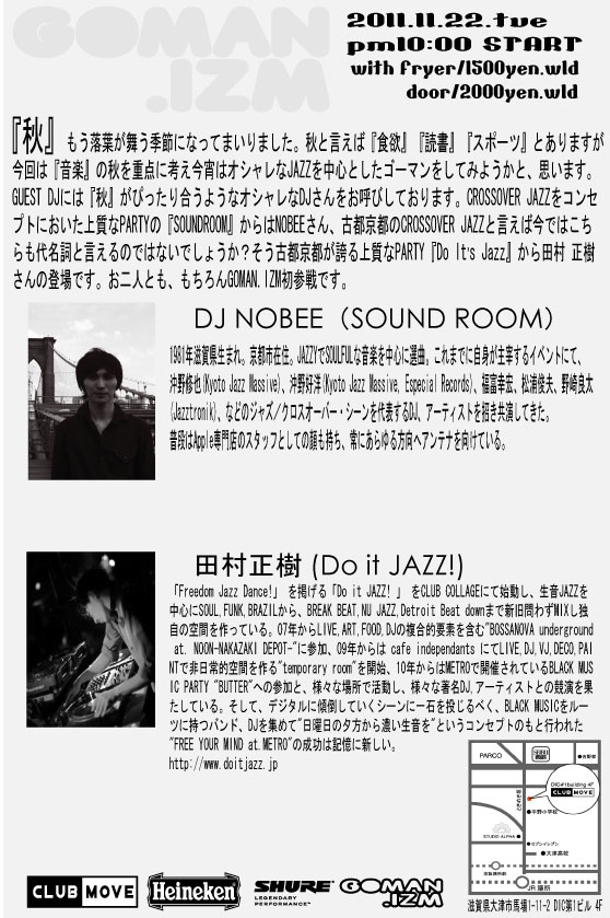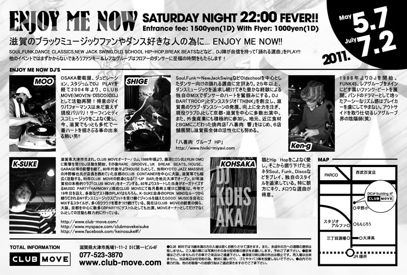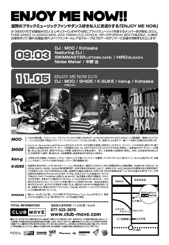 滋賀のブラックミュージックファンやダンス好きな人にお送りする~ENJOY ME NOW~。11/5はMOVEでお馴染みのDJ & レギュラーDJの中でも特にブラックミュージックを愛するメンバー達が集結。SOUL,FUNK,DANCE CLASSICS,NEW JACK SWING,OLD SCHOOL HIP-HOP,BREAK BEATSなどなど...DJ陣が自信を持って「踊れる選曲」をPLAY!!ファンキー&レアなグルーブはフロアーのダンサーに至福の時間をもたらします!