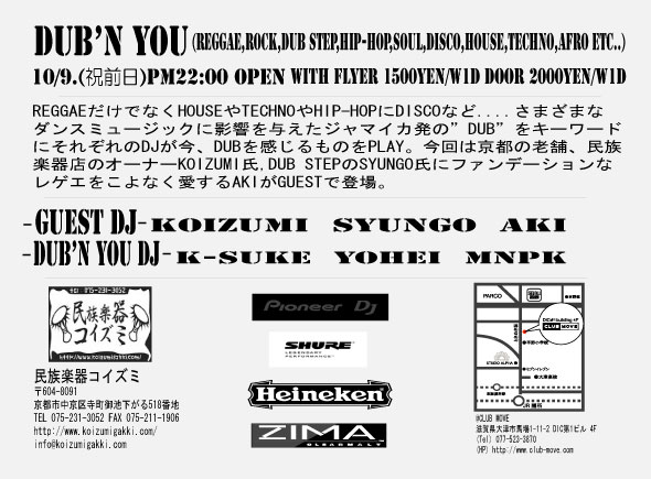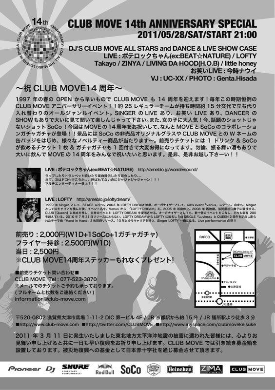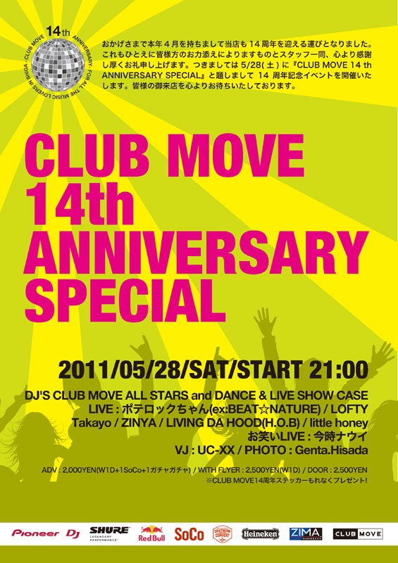 おかげさまで本年4月を持ちまして当店も14周年を迎える運びとなりました。これもひとえに皆様方のお力添えによりますものとスタッフ一同、心より感謝し厚くお礼申し上げます。つきましては5/28(土)に『CLUB MOVE 14 th ANNIVERSARY SPECIAL』と題しまして14周年記念イベントを開催いたします。皆様の御来店を心よりお待ちいたしております。