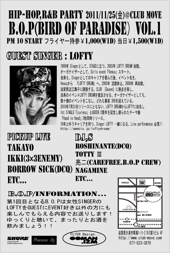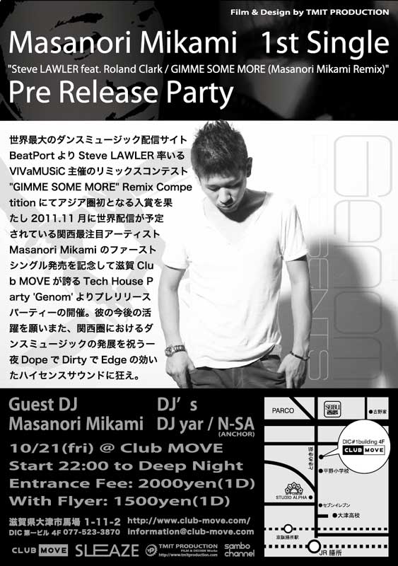 OSAKA葡萄屋、ジュビレーション、スタジゥムでDJ PLAYを経て2004年より、CLUB MOVE(MOVI'N DISCO)のDJとして活動再開!得意のマイクパフォーマンスは未だ衰えず現役バリバリ!サーフィンとディスコミュージックをこよなく愛し、今、滋賀でもっとも多忙で一番ハートを揺さぶる事の出来る熱い男!!