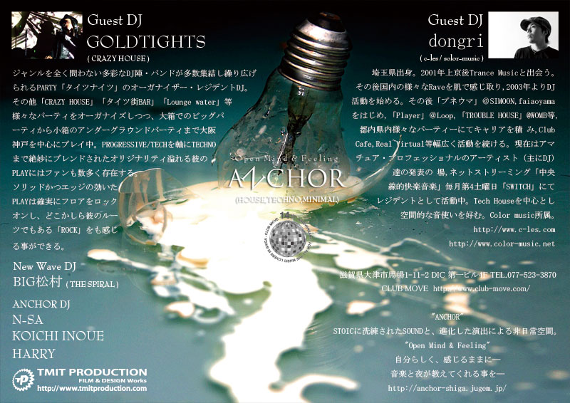ANCHOR主催。HOUSE,PROGRESSIVE,TECHNO,TRANCE,BREAKS,CHILLOUT等を駆使し、心情を音に乗せ表現するEMOTIONALなプレイスタイル。音に対し常にOpen Mindな姿勢で接し、閃きや空間のフィーリングに重きを置いたプレイでドラマティックな展開と一体感を創り出す。2011年より自身がレジデント兼オーガナイザーを務めるHOUSE,TECHNO,MINIMALパーティー「ANCHOR」をスタート。滋賀CLUB MOVEの奇数月第一金曜レギュラーを担当。CLUB PLAY以外にもBAR STYLE,SHOW BACK,IN STORE 等で活躍。ORIGINAL,REMIX音源の制作やSINGER,WEB等で楽曲提供も行い活動の幅を広げる。